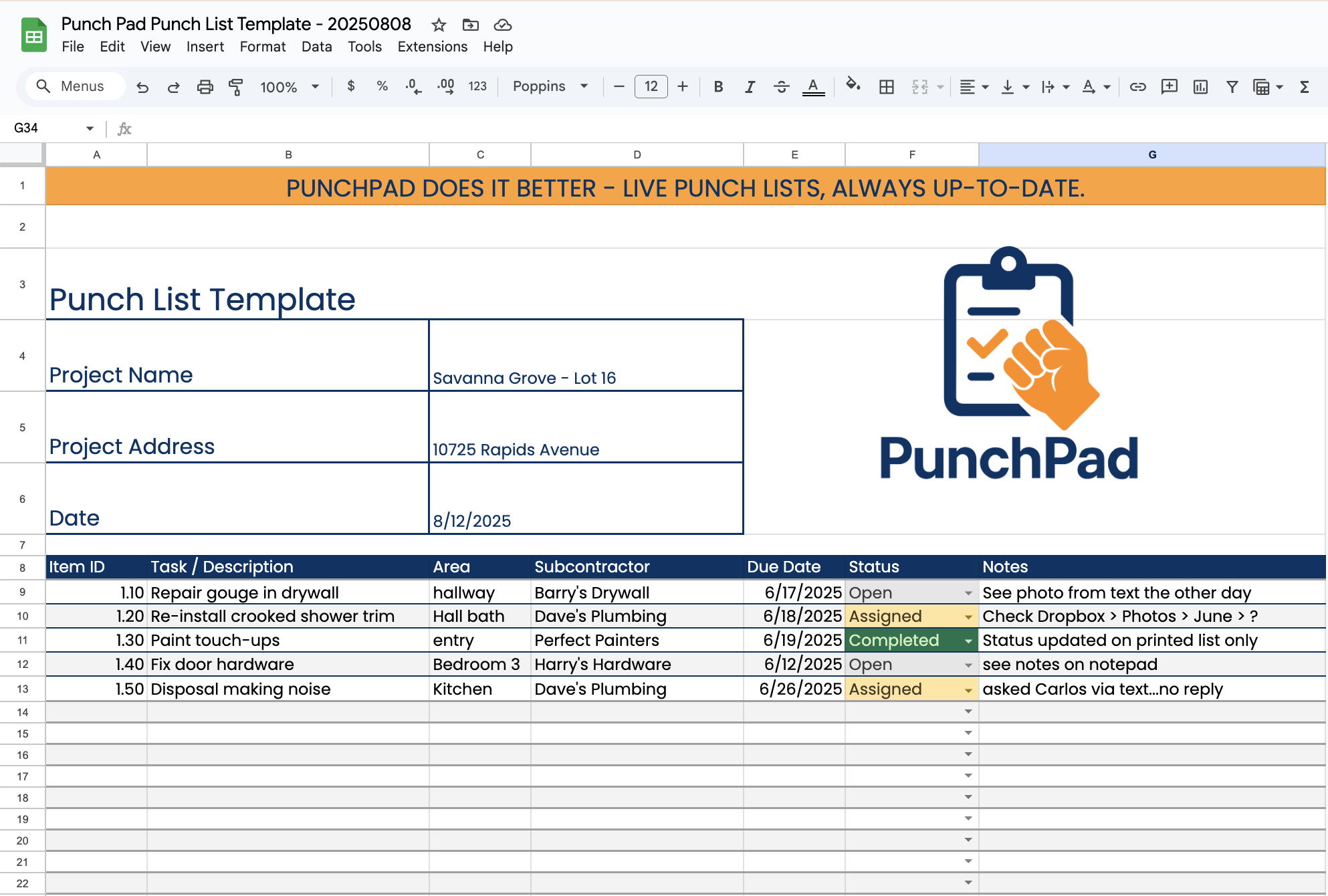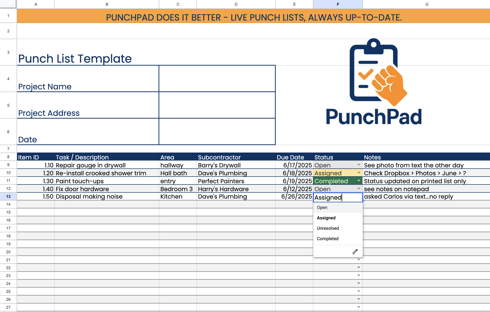 Our punch list Excel template includes built-in columns for task description, location, assigned trade, due date, status, and notes. To use it: